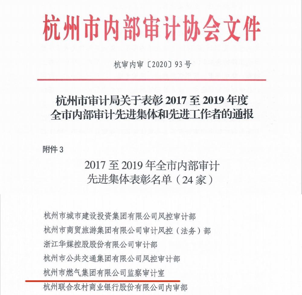 近日,杭燃集团获得杭州市审计局颁发的杭州市2017-2019年内部审计先进集体和内部审计先进工作者荣誉。这是继获得浙江省2019年度“内部审计结果运用”典型经验评比三等奖、杭州市2019年度“内部审计结果运用”成果评比一等奖的基础上再次获奖,这些荣誉是上级审计部门对集团公司内审工作的充分肯定。