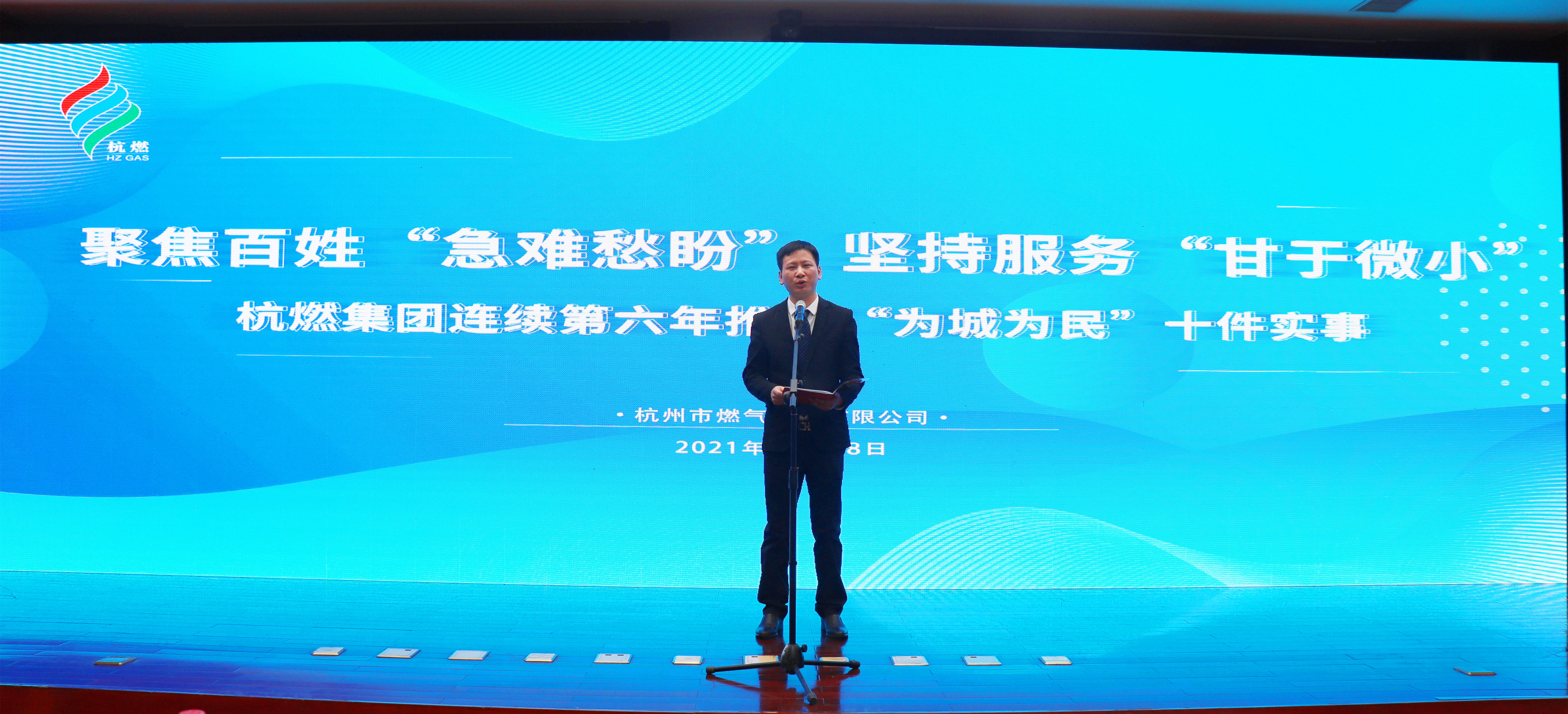 2021年12月28日上午,杭燃集团召开“为城为民”五年实事回顾暨2022年十件实事新闻发布会。社区代表李杨勇,用户代表程丽巧参加,新华社、浙江日报、浙江电视台、浙江之声、杭州日报、杭州电视台、杭州之声、杭州网、《燃情浙江》杂志、《温度管家》杂志等20家媒体现场报道。杭燃集团领导班子,集团各职能部门负责人、杭天公司经营班子及相关部室负责人、各参控股企业党政主要负责人等参加发布会。杭燃集团副总经理徐小冬作新闻发布。