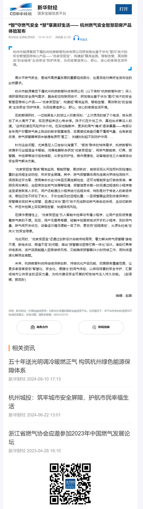 杭州市能源集团下属杭州杭燃数智科技有限公司(以下简称“杭燃数智科技”)深入调研居民的安全用气需求,融合前沿物联网技术,研发推出基于华为“星闪”技术的安全智慧厨房核心产品——“优家安厨宝”,构建起“精准监测、智能告警、高效联动”的全链条“主动安全”防护体系,为百姓营造安心、舒心、放心的家居生活环境。